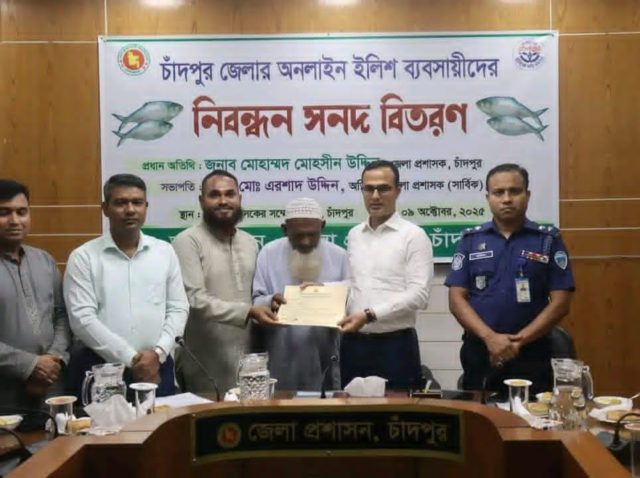 বৃহস্পতিবার (৯ অক্টোবর ) বিকেলে জেলা প্রশাসকের কার্যালয়ের সম্মেলন কক্ষে অনুষ্ঠিত হয় চাঁদপুর জেলার অনলাইন ইলিশ ব্যবসায়ীদের নিবন্ধন সনদ বিতরণ অনুষ্ঠান।